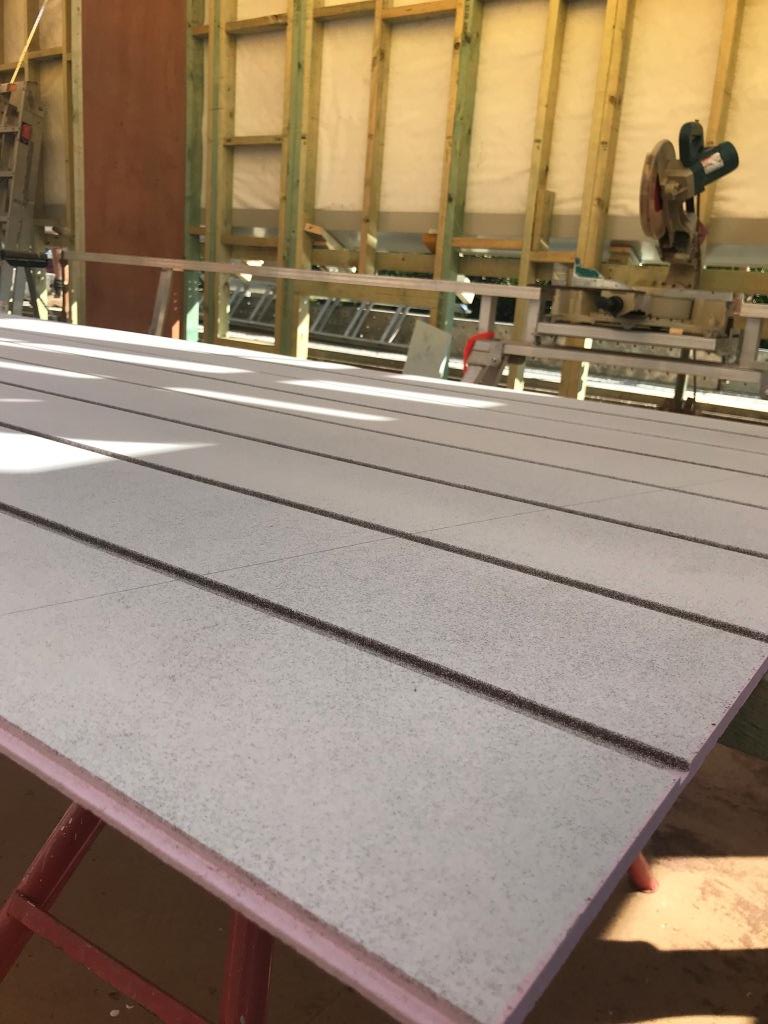 We’ve started cladding the exterior with Weathertex Weathergroove, a product made by pulping down hardwood and then compressing it under extreme pressure (just like a diamond!). This creates a stable, solid product that’s formed into sheets with a good range of profiles and surface textures. I like it because it’s 97% natural hardwood, contains no resins, binders or added formaldehydes, so despite the bit of sawdust on her nose, site dog can breath easy! http://weathertex.com.au/product/weathergroove-smooth-150/